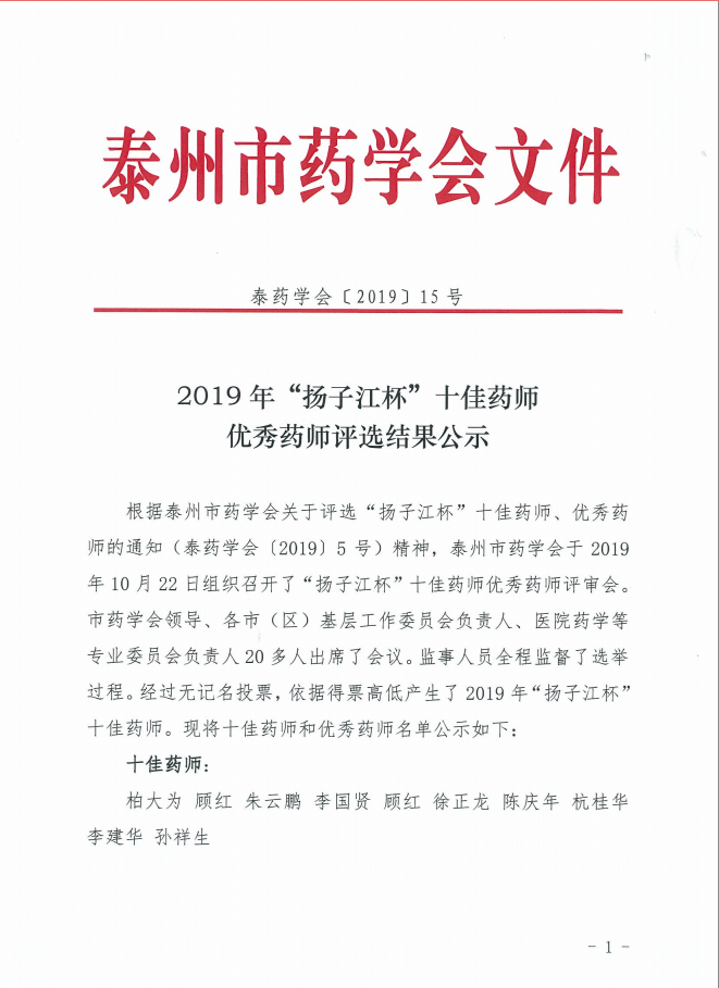 2019年“扬子江杯”十佳药师优秀药师评选结果公示
