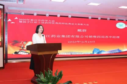 扬子江药业集团有限公司销售四局苏中区经理戴群在大会上致辞。她向出席本次会议的各位嘉宾表示热烈的欢迎,向所有获奖的药师表达衷心的祝贺!感谢各位为提高安全合理用药水平,守护人民群众健康安全所付出的不懈努力!