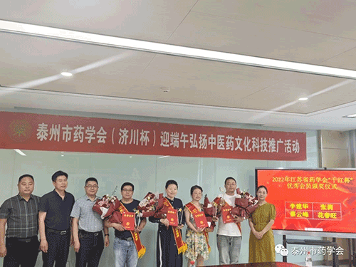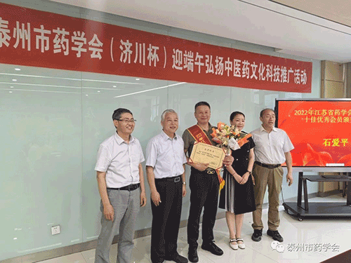 颁奖环节,对获得2022年度江苏省药学会“千红杯”十佳优秀会员(泰兴市人民医院石爱平)和4名优秀会员(泰州市人民医院李建华、靖江市人民医院张莉、泰州市第二人民医院花春旺、泰州市第四人民医院蔡云峰)进行了颁奖仪式。