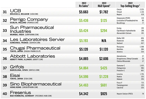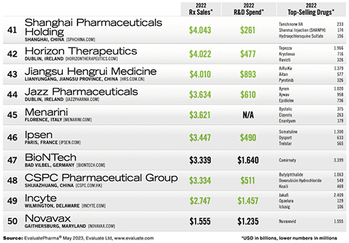 2019年,该榜单首次有中国药企入选,中国生物制药在当年排名全球第42位,为中国药企第一。2023年的榜单中,四家中国药企中,中国生物制药排名39(去年第40名),连续第五年上榜,并再次登顶中国制药企业首位;其次为上海医药,排名41;恒瑞医药排名43,石药集团排名48。